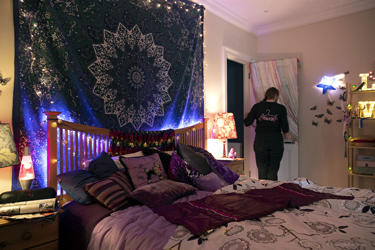 Production Designer May Davies and Standby Props Kitty Lower set dressing the master bedroom on our first day in the location house